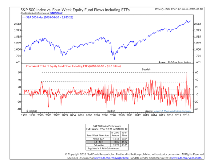 Buy after the market goes up. Sell after the market goes down. While that is not the ideal strategy, this is exactly what individual investors have done for as long as the data has been tracked. 2018 has been no different. As the stock market rallied over 7% in January, investors flooded into the market…….just in time for a 10%, 8 day decline. The pattern has repeated a few more times this year as this week’s Chart of the Week illustrates (green marks the peak in buying, red is the trough in selling).