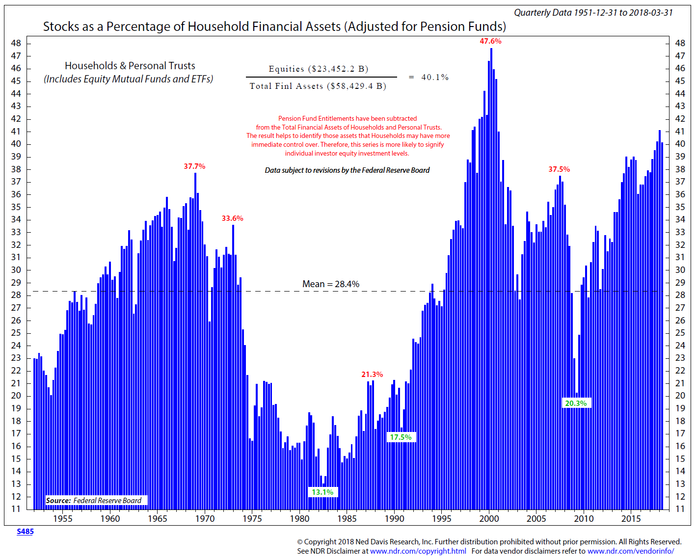 Another interesting thing is shown in Bonus Chart of the Week #3……the percentage of household assets “invested” in stocks. I put invested in quotes because the fund flow data clearly indicates individuals are not investing in stocks, but chasing returns.
