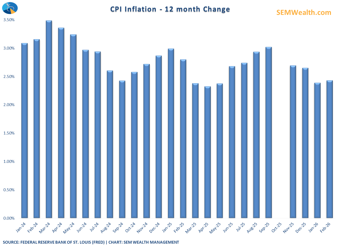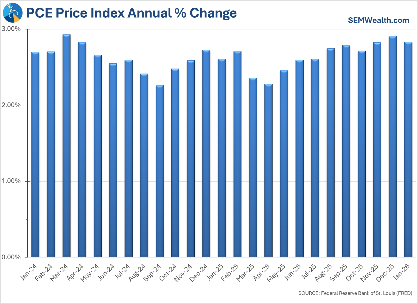 Going into the year, the thought was inflation would continue trending towards 2%, which would allow the Federal Reserve to cut interest rates multiple times. Unfortunately that has not been the case and the rate of inflation is still running closer to 3% than 2%. There are 2 measures of inflation. The Consumer Price Index (CPI) is the most popular metric used in the media, but it has some flaws which make it more volatile and much less reliable to set economic policy. This chart shows the annual change since the beginning of 2024.