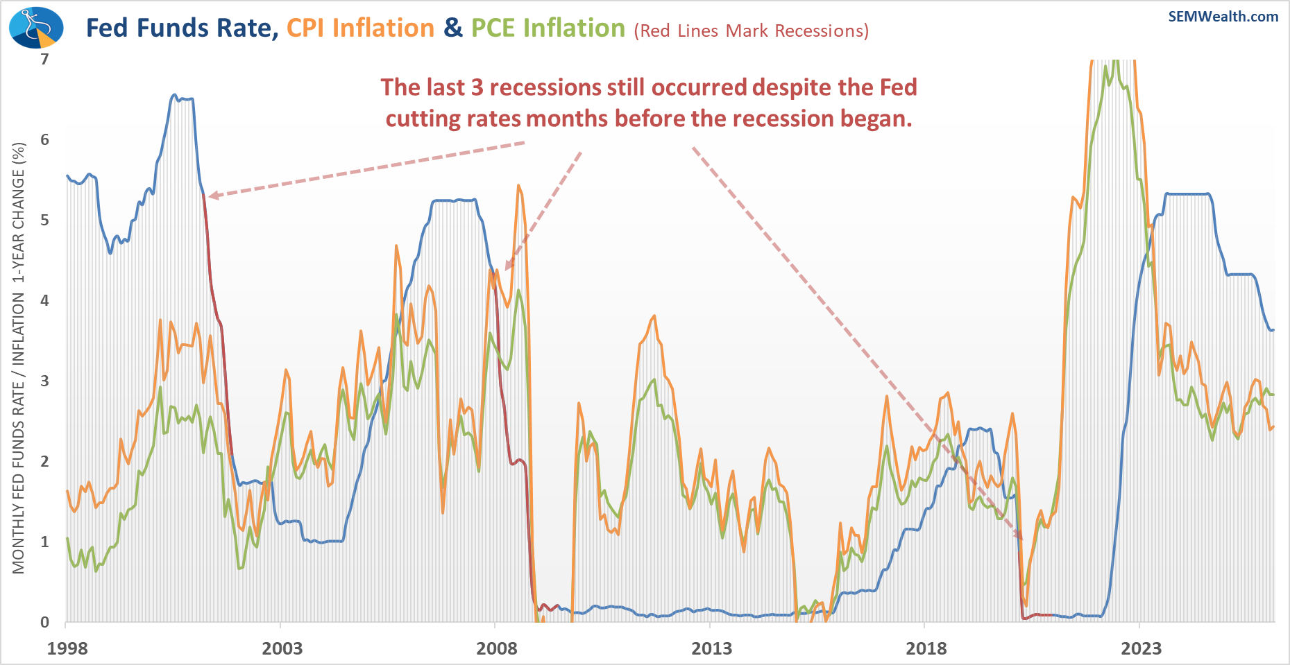The Fed has now taken a "pause" on cutting rates. One thing I think is important to understand is the fact the Fed has both been historically wrong about the direction of inflation and unable to prevent a recession. This chart overlays the Fed Funds rate (blue line with red lines marking recessions) with the CPI and PCE annual changes. A drop in the Fed Funds rate signals when the Fed was cutting rates (easing) and a rise shows when they were raising rates (tightening).