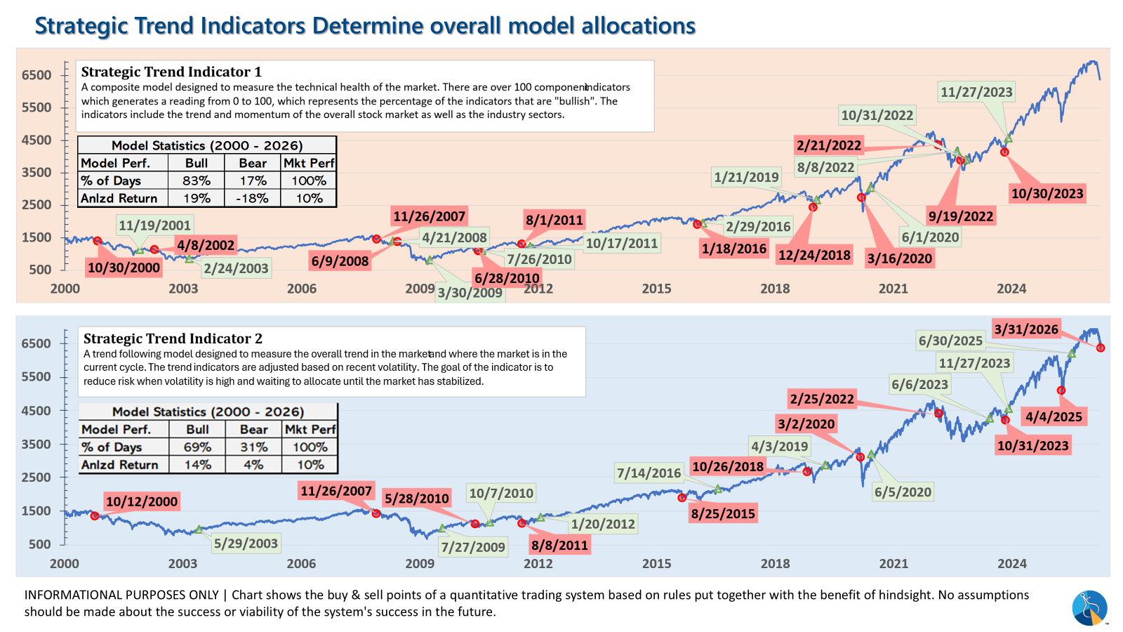 - One TREND indicator issued a SELL on March 30, 2026 bringing stock allocation down to 50% in Balanced, 70% in Moderate, and 85% in Growth)