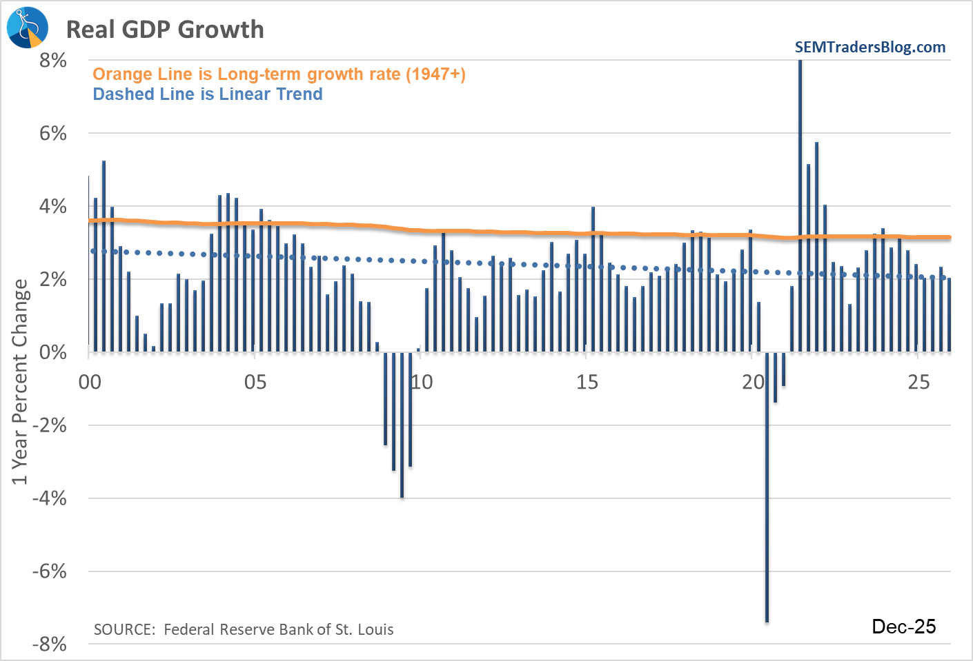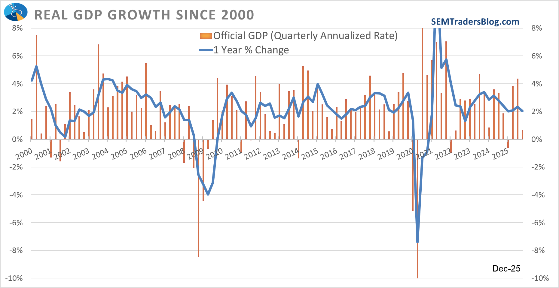 One point of confusion has always been the "official" GDP growth number. It has very wild swings because it is the only indicator where the last 3 months are essentially multiplied by 4 to give an "annual" number. The chart below shows the "official" release in orange, with the actual 1-year growth marked by the blue line.