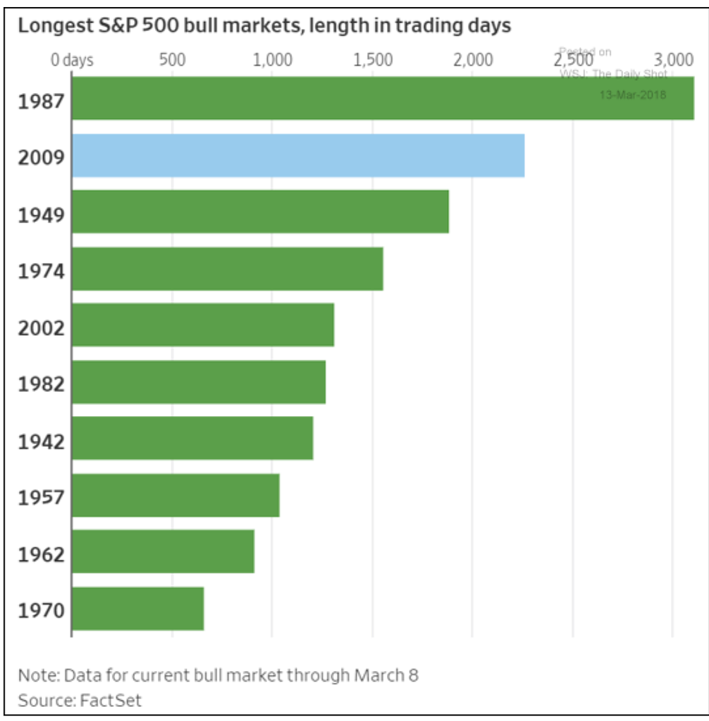Last week we celebrated the 9 year anniversary of the start of the current bull market. I included some charts illustrating how abnormal this run has been. The Wall Street Journal last week put the current bull market in perspective with this week’s Chart of the Week.