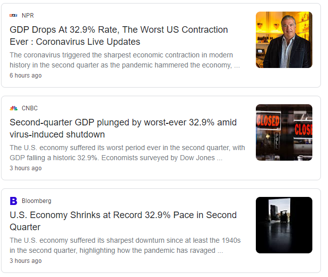 These headlines are shocking and certainly something I don't want to make light of. While it is indeed the worst number since the Great Depression, the way GDP is calculated does not fairly represent what is actually happening. The government takes the estimated economic output for the last three months,