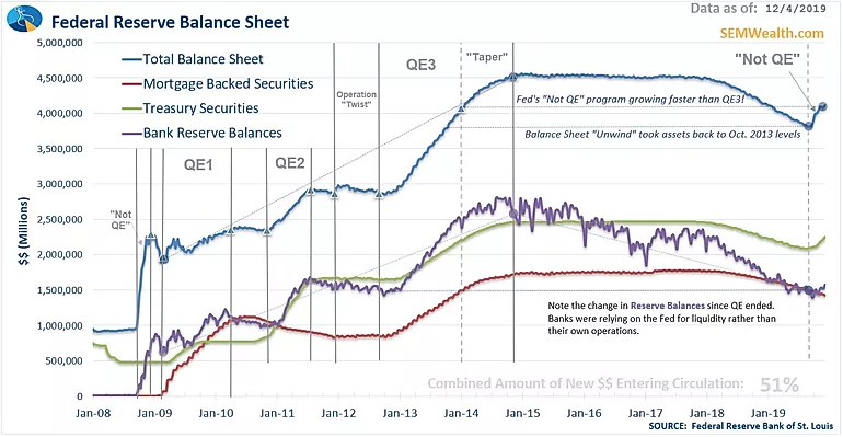 Lest we forget as late as August 2008, the Federal Reserve believed the problem in the banking system was both "contained" and "temporary". The reason I bring this up is because once again we've seen how dangerous it is to trust the Federal Reserve to control the financial system. Back in September we saw the overnight lending market essentially frozen as banks struggled to come up with enough cash to meet demands on the money. The Fed rushed to help and created a "temporary" program that Fed Chairman Jerome Powell has consistently argued is not Quantitative Easing to assist in the "short-term" funding issues.