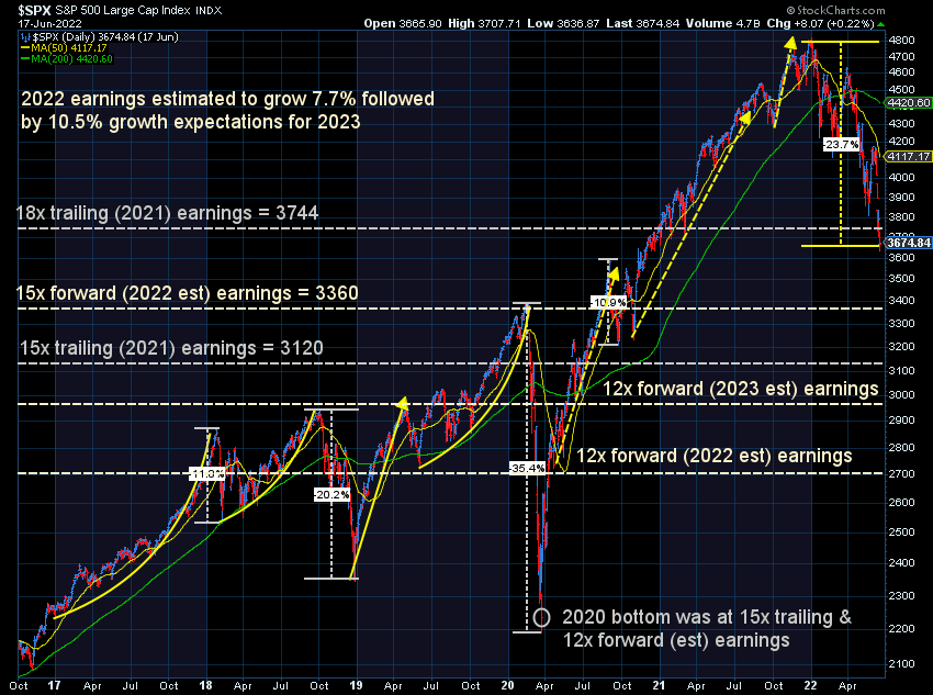The "median" P/E over the long-term (based on the last 12 months of earnings) is 15 with the forward P/E (based on EXPECTED earnings) is 12. This also happened to be the level the S&P 500 reached in March 2020. Looking at the chart below, if we revert back to the median (and March 2020) levels "fair value" for the S&P is somewhere around 2700-3120 (or another 18-29% from here). That would put the total losses around 40-50%.......if earnings do not decline from here and if valuations do not go to the depths of past recessionary bear markets (in the 9-12 range).