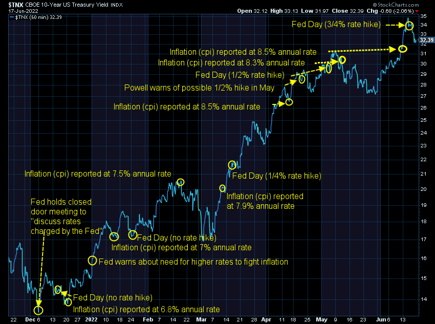 This chart of bond yields tells the whole story. The bond market saw inflation. The Fed did not. The bottom of bond yields came in December when the Fed held an unscheduled meeting to discuss inflation and Fed policy. This was after they told us throughout 2021 inflation would be "transitory". They didn't decide to finally raise rates until four months after they "discussed" changes in rates. A month ago, Chair Powell said a 75 bps rate hike was not on the table. Now they not only hiked rates by that amount, but said it's a possibility they will do that again next month.