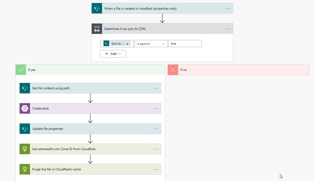 We actually have two flows. The first one runs whenever a file is created or modified in the External Files document library. It checks to see if the Sync to CDN column is set to Yes, and if so: