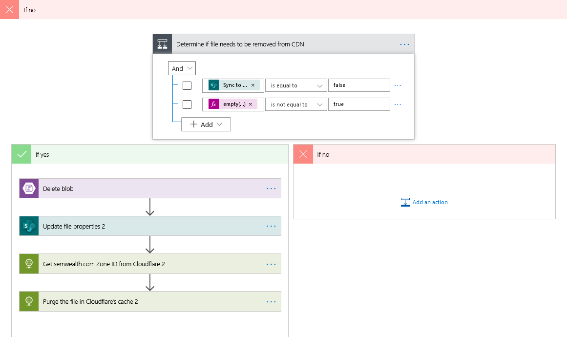 This means that users can delete files from the SharePoint document library and those files will be removed from the CDN by the next morning. If a file needs to be removed from the CDN before then, our users have been trained to first change the file's Sync to CDN column to No - which will trigger the first flow and pull the file off the CDN within about 60 seconds. The file can then be deleted if necessary.