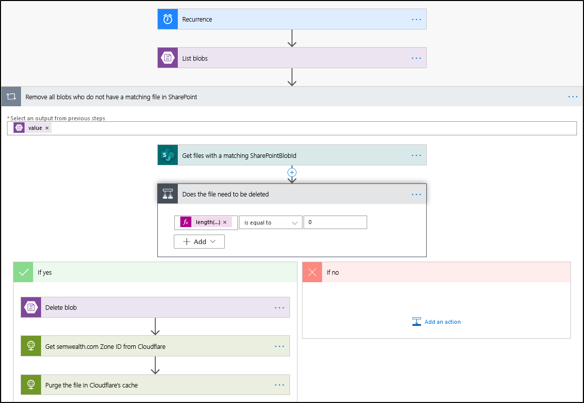 The second flow allows us to deal with files that are deleted in the document library. Initially I tried to trigger the flow when a file is deleted in the document library, but the trigger action doesn't return custom metadata properties for the deleted file (because it runs after the file is already deleted). This means that there's no way to match the deleted file with a blob in the blob container.