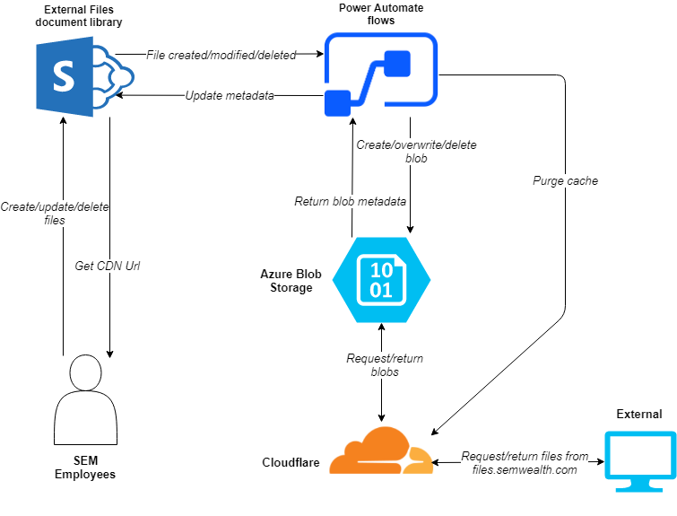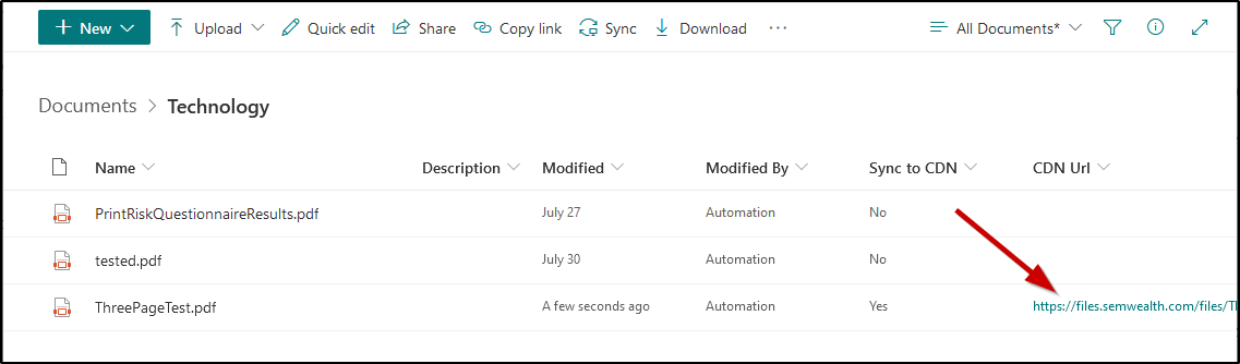 In this site's document library, we also created some custom metadata columns. One of these columns is a Yes/No column titled Sync to CDN. When this column is set to Yes, it kicks off a Power Automate flow which copies the file to an Azure blob container. This blob container has a custom domain (files.semwealth.com) and sits behind Cloudflare, so HTTP requests do not actually hit the blob container very often, which minimizes cost and makes files highly available around the world. After the file is copied from SharePoint to the blob container, another custom metadata column is populated with the CDN-relative URL (something like files.semwealth.com/[filename]).