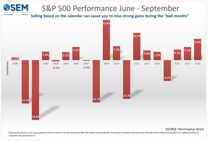 As I do each year, I caution anyone from making wholesale changes based on the calendar. There have been times the “bad” months have had significant gains (just as the “good months” can have significant losses. 2018 was one example. Stocks rallied 8.4% in May-September and then fell 13% in the October-December period. SEM does not specifically use the calendar to make allocation adjustments. However, our Price Divergence System, which is a key part of our EGA model does have rules that make it easier to sell in the June – September period (and harder to sell in the October – December months).