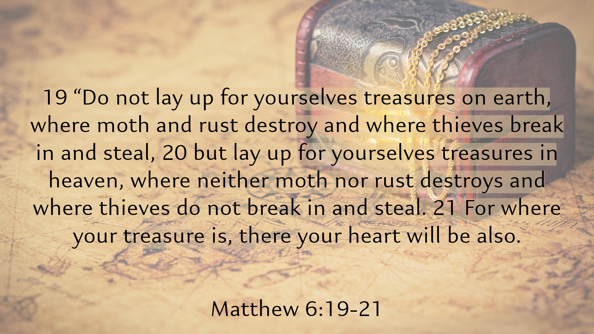 This section starts with comparing earthly treasure and heavenly treasure. Earthly treasure is temporary. It can be easily destroyed and taken away. However, treasures in heaven are eternal. That is where our heart should be – on heavenly treasure. But what is heavenly treasure? People. Our value should be on people, God's creation, instead of our temporary possessions.