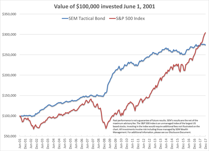 With the benefit of hindsight, you could say a client in our Tactical Bond program would have been better off investing in the S&P 500. This chart illustrates the hypothetical growth of $100,000 invested in Tactical Bond & the S&P 500 index on the day we spun Tactical Bond out of Income Allocator. Assuming the investor would not have sold at anytime during the 2001-2002 or 2008-2009 bear markets, the S&P 500 investor would have earned about $38,000 more than the Tactical Bond investor.