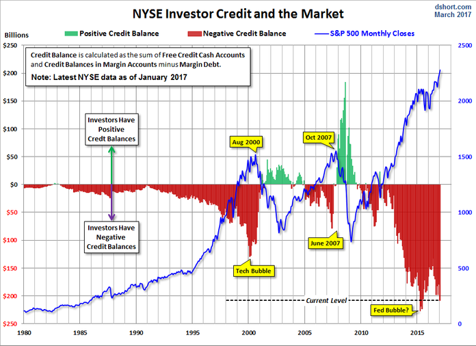 Not only is there not “cash on the sidelines” that stands ready to support stocks during a correction, this sets things up for margin calls should stocks begin to fall (stocks are collateral for the margin debt, so when their value drops the banks force them to sell stocks to pay back their loans.)