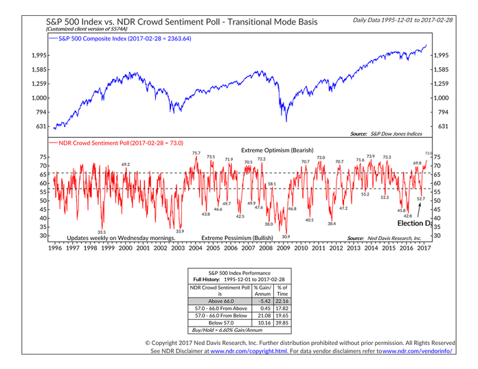 Despite that fight, you can’t fight the enthusiasm right now. The simple fact sentiment measures have hit extremes, such as the NDR Crowd Sentiment reading, is not a sell signal by itself, but it is a warning that it will not take much to spark a sell-off.