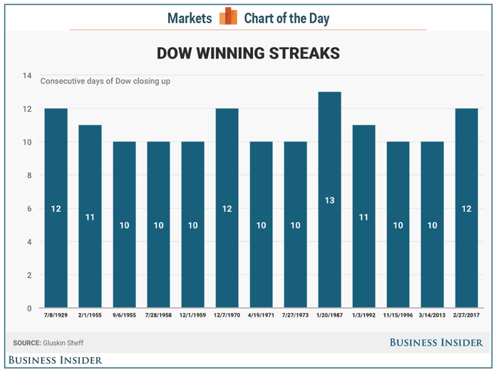 If the Dow closes today up today, it will tie the longest winning streak in history.