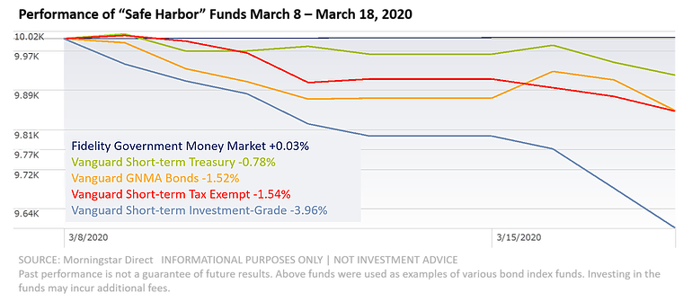 I'm glad they did all of the above. They had to. Early last week at SEM we started noticing strange behavior in the funds we call "safe harbor" funds. As our long-time readers and advisors know, when we exit risky assets (as we did in bulk the last week of February and first week of March), we move the money into lower risk assets. The first stopping point is short-duration bonds (maturity within the next 3 months). This provides some interest payments while we wait for a more stable environment. During a crisis, these funds typically go up in value as the market participants move to "high quality" investments.