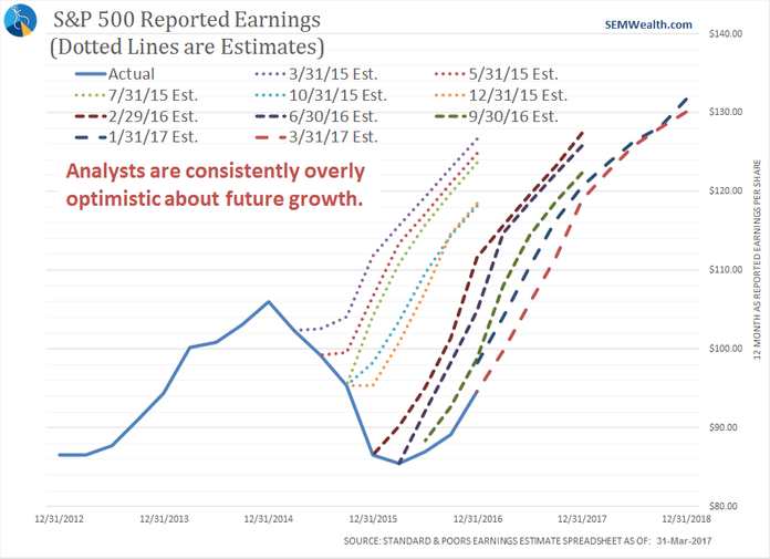 The problem is not the numerator in that equation but what earnings number do you put in the denominator. On Tuesday I showed the P/E ratio using the trailing 12 months operating earnings (don’t even get me started on that number and all the normal expenses that are excluded from that number). The S&P 500 would have to fall 30% to get back to median valuation levels. That is a problem for the Wall Street marketing machine, so they have taken to using a “forward” P/E ratio. This takes the current price divided by the expected earnings for the next year. We showed yesterday why you would be a fool to use a forward P/E ratio — the earnings actually achieved are almost always significantly lower than what was expected 12 months ago. When you use a forward P/E to evaluate stocks you end up paying for a 1/2 pound hamburger and only getting a 1/4 pounder.