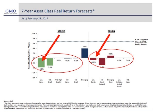 All we we’ve been discussing valuations and what they mean based on an article by John Mauldin . One of the primary reasons valuations are important is if you invest when valuations are high, you should expect significantly lower returns. Conversely, when you invest when valuations are low, your longer-term returns are significantly higher. With valuations in the “overvalued” range, the expected returns are quite low based on the DATA. GMO has run the numbers and their DATA says the next 7 years could see NEGATIVE returns in most asset classes.