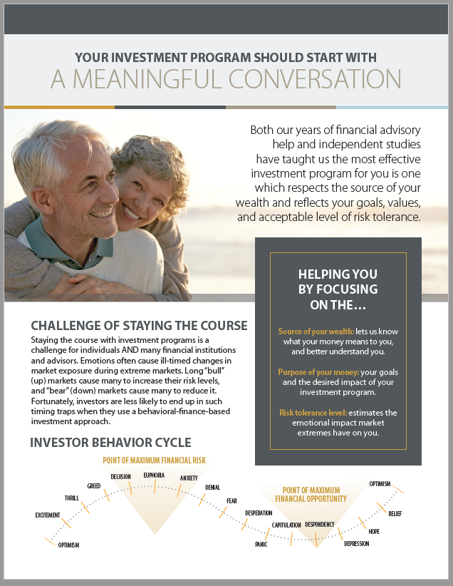 The Vanguard Study is something I think is enlightening. Even though in their marketing efforts Vanguard spends all their money telling everyone what they SHOULD be doing. Their study shows how much value Advisors have added (after paying the fees Vanguard tells you not to pay). Notice where the most value is added — Behavioral Coaching. This can mean a lot of things, but for us it means a complete Behavioral Approach to Investing. It starts with the first conversation and continues into the creation of customized portfolios, the on-going monitoring, periodic financial reviews, and constantly working with the client to ensure they are comfortable with the path they are on.