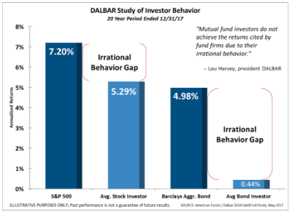 The author mentions two studies — the DALBAR Study of Investor Behavior and Vanguard’s “Putting a Value on Your Value”. With the stock market approaching the highs from 2018 (again) I thought it would be appropriate to include those two studies as our Chart of the Week.