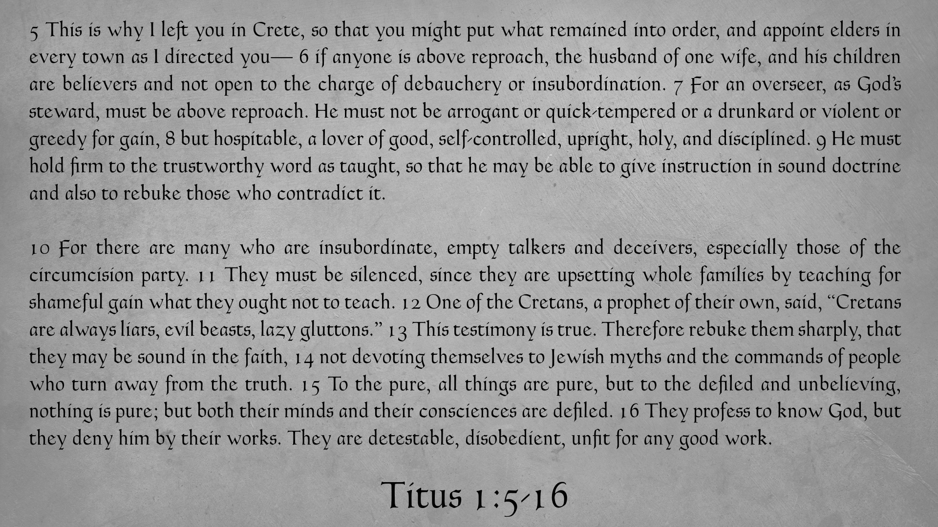 After the intro, we find in Titus 1:5, Paul commissions Titus to appoint elders in every town in Crete. These leaders weren't chosen for their charisma, social status, or wealth—qualities that might have been prized in Crete. Instead, Paul emphasizes godly character. The qualifications echo those in 1 Timothy 3 and Acts 14:23, focusing on integrity, faithfulness, and the ability to teach and manager their households.