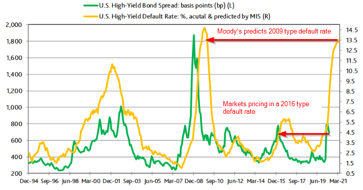 -Not Everybody Can be Saved: Bankruptcies / defaults will still happen; small businesses will fail at a heavy rate; These losses will create significant damage to the economy, similar to the Global Financial Crisis (or worse). Stocks lost 53% in 2008-2009. They are only down 12-15% today. The markets seem to think this will be just a small speed bump. Moody's disagrees. They are predicting a huge spike in defaults, which the market is not yet pricing in. If they are right, this will have very negative consequences for both stock and bond investors. Who would you trust – the people who look at each underlying issue or the people investing under the belief the Fed will save everyone?