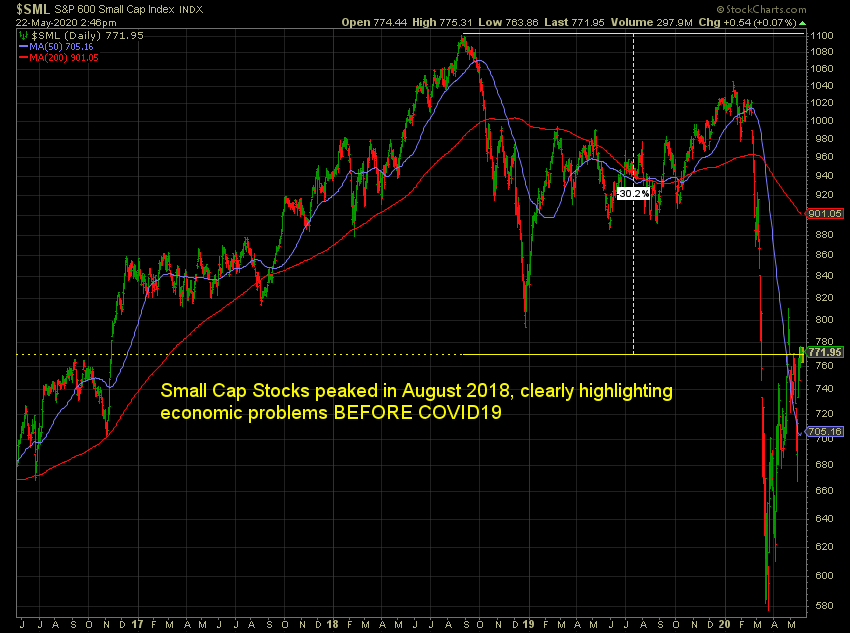 Small company stocks are down 30% from their 2018 highs (yes I said 2018) and are back to the same level they were at at the end of 2017 — just before the Trump tax cuts went into effect. In a healthy economy these companies would be thriving, instead they are clinging to life. COVID19 has only made it worse.