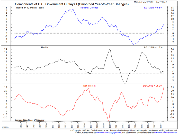 Finally, this is where it all comes together to the main topic for today — the impact of rising interest rates. Already 25% of government spending is going towards interest rates. As rates go higher and the government has to not only refinance the record setting old debt, but borrow more to support current spending, this will eat away more and more of our budget.
